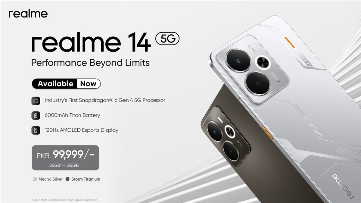 realme has officially launched its groundbreaking realme 14 Series in Pakistan, bringing flagship-level performance at unbeatable prices. The lineup features the realme 14 5G at PKR 99,999 with up to 26GB dynamic RAM and 512GB storage, and the realme 14T 5G at PKR 79,999 with up to 26GB dynamic RAM and 256GB storage.
